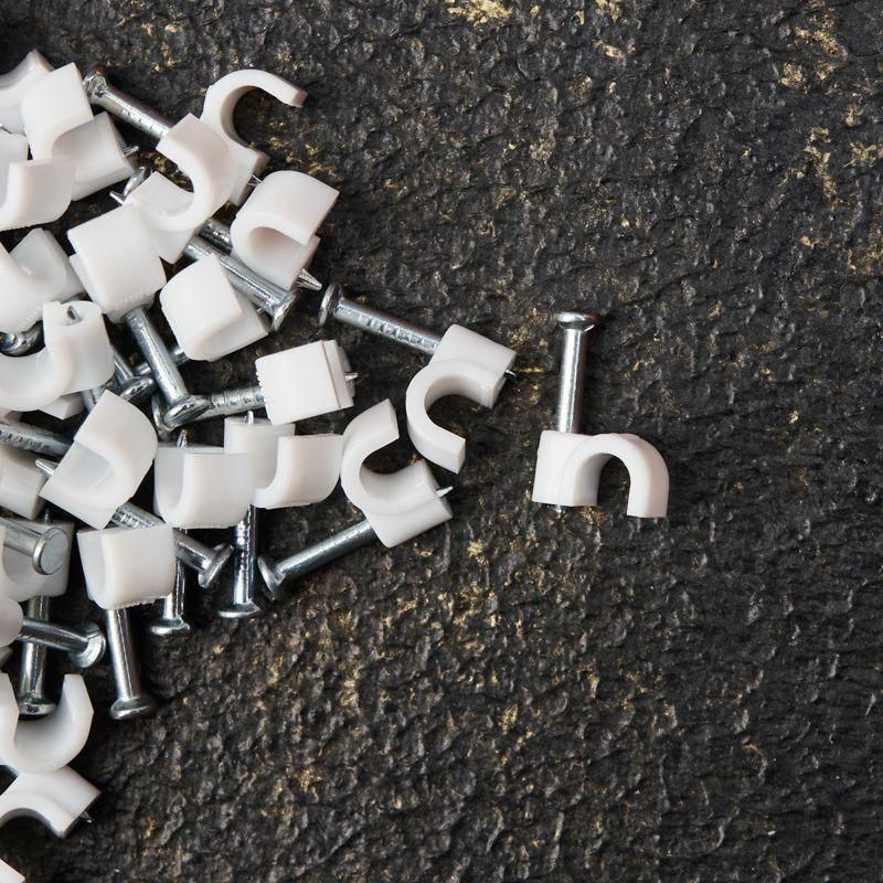 Круглый крепеж 4 мм с гвоздем предназначен для фиксации круглого кабеля к деревянной поверхности. Такой крепеж будет особенно полезен для использования на даче или в частном деревянном доме. Представляет собой дугообразную скобу белого цвета, выполненную из качественного пластика, с гвоздем в специальном отверстии. Скоба используется для мгновенного и надежного крепления проводов и кабелей к поверхностям стен, несущих конструкций и потолков. Гвоздь выполнен из закаленной стали, что позволяет закрепить его даже в плотной и твердой древесине без риска погнуть или сломать.